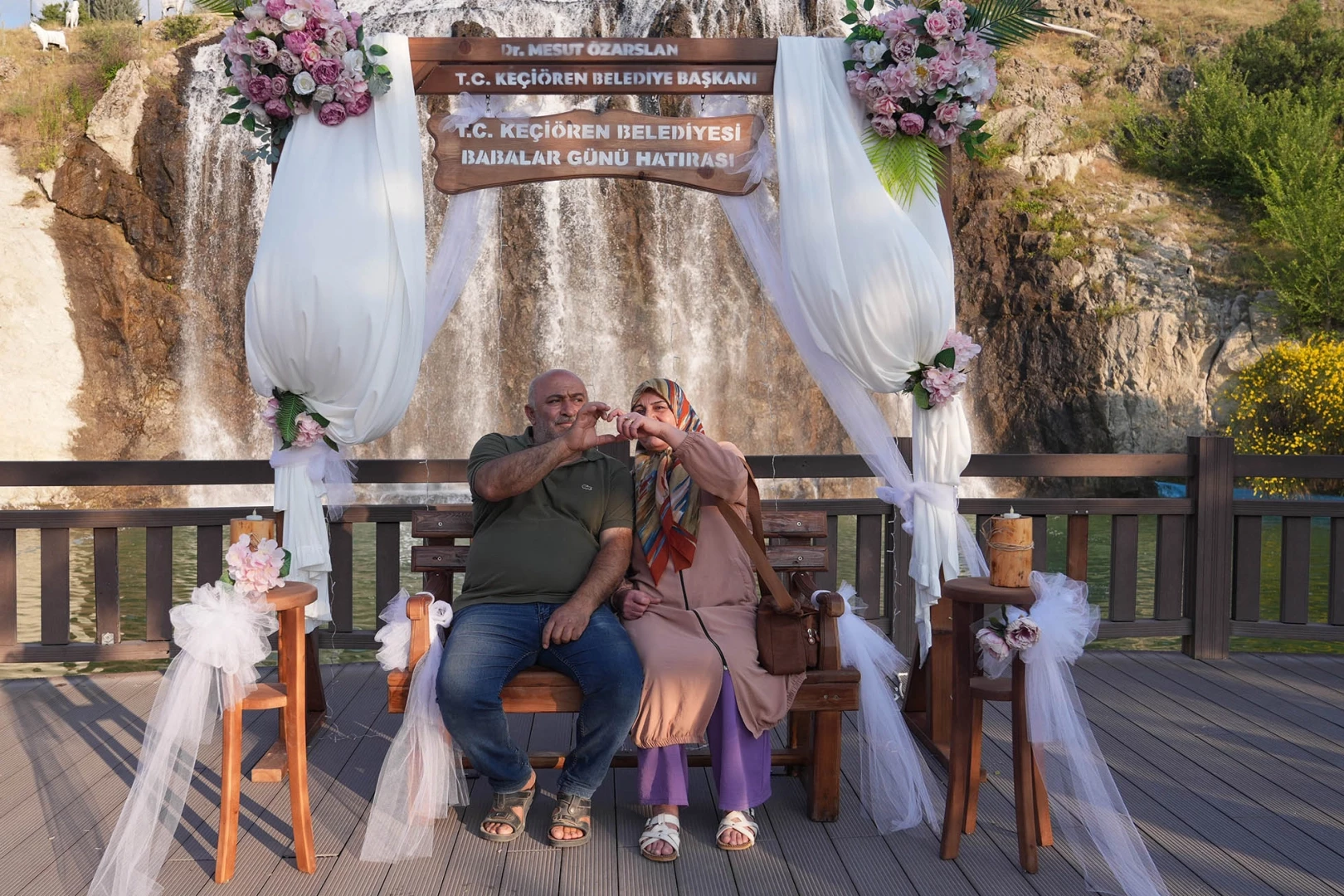ANKARA (İGFA) -Doğal şelale manzarasına karşı konumlandırılan çiçek süslemeli ahşap pano, piknik yapan ailelerin uğrak noktası oldu.