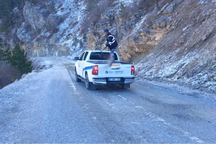ANTAYA (İGFA) - Antalya Büyükşehir Belediye ekipleri soğuk hava nedeniyle buzlanma ihtimaline karşı yolları açık tutmak için tuzlama yapıyor.