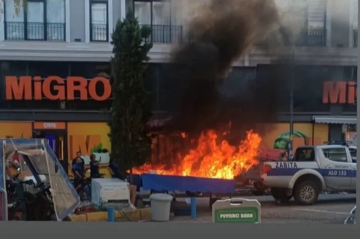 Balıkçı tezgahını balıklarla beraber ateşe verip yaktı