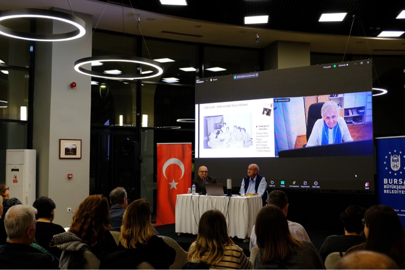 BURSA (İGFA) - Dünya ve Türk edebiyatına sayısız eserler kazandıran şair ve yazar Nâzım Hikmet, Bursa Büyükşehir Belediyesi tarafından hazırlanan çeşitli etkinliklerle anılıyor. 2024 yılını Nâzım Hikmet’e adayan Büyükşehir Belediyesi, yıl boyunca şairin evrensel sesinin, devrimci ruhunun ve insanlık onurunu her şeyin üstünde tutan hayat görüşünün, kentin kültürel rotasına ışık tutmasını amaçlıyor. Etkinlikler kapsamında hazırlanan ‘Büyük Tanıklık: Gün Benderli Nâzım Hikmet’i Anlatıyor’ programı, Atatürk Stadyumu Kütüphanesi’nde düzenlendi. Erden Akbulut ve Turgay Fişekçi'nin sunumuyla başlayan programa, Budapeşte’den canlı bağlantıyla katılan Yazar Gün Benderli, sıcak ve samimi yaklaşımıyla Nâzım Hikmet’i sanatseverlere anlattı.