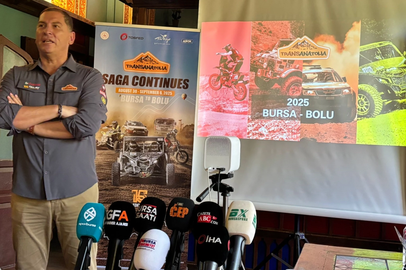 Bahsettim yarıştan rotanızdan ama birazcık güzergahlardan bahsedersem, yaklaşık her gün 250 kilometrenin üstünde bir yol yapacak yarışmacılar. Bunun büyük bir kısmı özel etap, arada da normal bağlantı yollarımız olacak. İşte birinci gün 260 kilometreye yakın, en uzun günde de 432 kilometre yol yapacaklar Haymana'dan Kapadokya'ya. Şöyle düşünün, bu yolun çoğunluğunu arazide düşünürseniz gayet zorlu ve dayanıklılık isteyen bir yarış. Transferin burada en büyük amacı tabii ki spor turizmini değerlendirmek ve göstermek. Bizim en büyük destekçilerimiz tabii ki Spor Bakanlığı ve Türkiye Otomobil Sporları Federasyonu. Türkiye Otomobil Sporları Federasyonu il temsilcisi Mithat Bey de bizle beraber, bizi kırmadan geldi. Çok teşekkür ediyoruz. İkincisi Turizm Bakanlığı, çünkü Turizm Bakanlığı spor turizminin önemini çok iyi kavramış durumda son dönemlerde. Bu tür sportif aktivitelerin turizme katkısını beraber değerlendiriyoruz. Buradaki komisyonu yurt dışında yayınlamak için özel bir çalışmamız var. Neden önemli? Start Bursa'da ve Bursa'da insanlar çok vakit geçirecekler ve Bursa'yı da yabancı sporculara tanıtma imkanımız olacak. Sizler de bu start günü özellikle sporcularla birebir ilişki kurup röportajlar yapma imkanına sahip olacaksınız. Bunu şöyle çok önemli buluyorum açıkçası. Biz dünyada her yere gidip Türkiye tanıtımları yapıyoruz ama şunu fark ediyoruz: Hala Türkiye'yi tanımıyorlar. Yani artık bu dijital medyanın bu kadar kuvvetli olduğu, sosyal medyanın bu kadar kuvvetli olduğu bir dönemde, Türkiye'nin hala az tanınıyor olmasına çok şaşıyorum. Yaptığımızın %60'ı yarışla alakalı değil, Türkiye ile alakalı sorular üstüne geçiyor. Burada kendimizi bir turizm olarak görüyoruz ve hep Türkiye'deki bu güzellikleri anlatmak istiyoruz. Çünkü Türkiye gerçekten bence motor sporları için, özellikle ralli tarzı yarışlar için efsane bir coğrafyaya sahip. Yani, çünkü dünyadaki ilk beş yarıştan biri şu an zorluk ve uzunluk açısından baktığınızda. Diğer yarışlara baktığınızda %80'i çöllerde geçiyor. Yani ya pasta yapılıyor ya Suudi Arabistan'da yapılıyor ve özünde hep bir çöl var. Halbuki Türkiye'de bir gün Tuz Gölü'nden geçiyorsunuz, bir gün 2.500 metre ormana çıkıyorsunuz, deniz seviyesine iniyorsunuz. Yani coğrafyası o kadar güzel ki ülkemizin, hepimizin diyoruz ama bunu gösterme fırsatımız oluyor. Çünkü normalde insanların yolunun düşmeyeceği yerlerden geçiyor Trans Anatolia. Yani bizim bir etabımızda birinin gitmesi için uçaktan inip araba kiralayıp 100 kilometre yol yapması lazım. Biz bunu yaklaşık bu senede 600 kişilik bir ekip olacak; transfer, bu 600 kişiyi beraber taşıyor olacağız.” dedi.