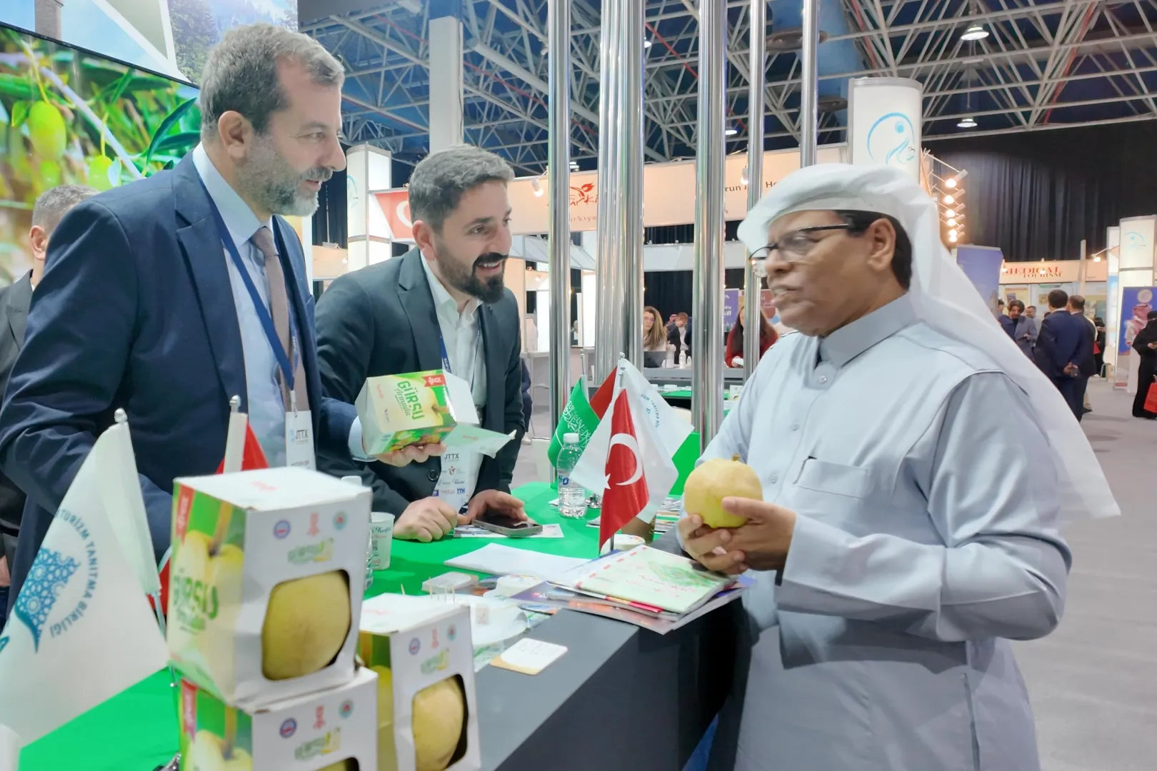 Bursa Gürsu Belediye Başkanı Mustafa Işık, Bursa standında, fuarın ilk gününde Gürsu’nun tescilli lezzeti olan Deveci Armudu ve Santa Maria armutlarını tanıttı.