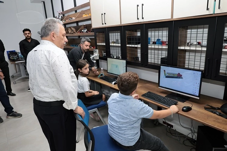 Burada eğitim gören ilkokul ve ortaokul öğrencileriyle bir araya gelen Başkan Yalçın, robotik kodlama, arduino, modelleme ve baskı alanlarında verilen kurslarla ilgili yetkililerden bilgiler aldı.