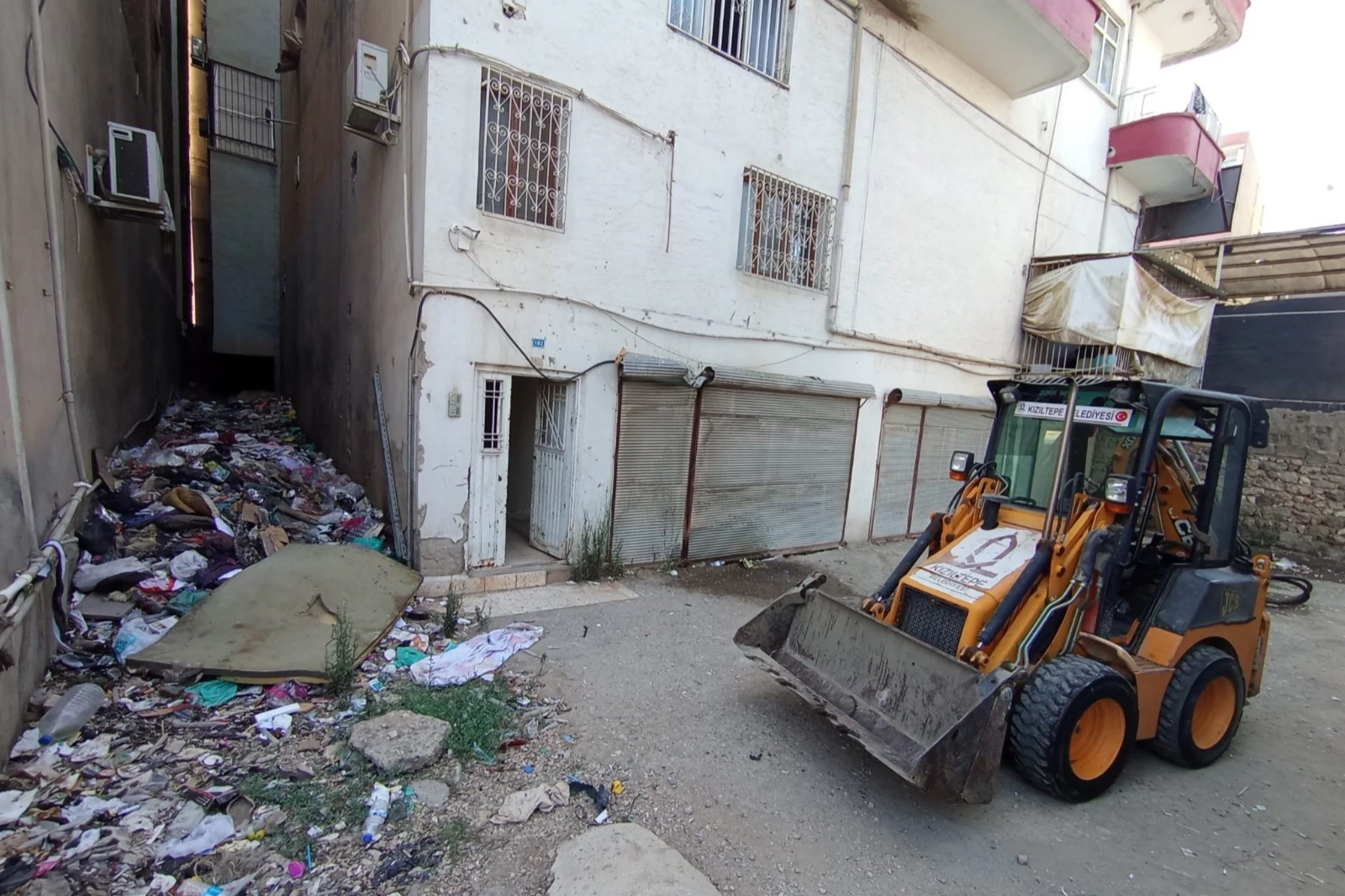 Şahkulubey Caddesi üzerinde yer alan iki apartmanın boşluğuna atılan çöpleri iş makineleriyle temizleyen Kızıltepe Belediyesi ekipleri, apartman boşluğundan bir kamyon çöp çıkardı.