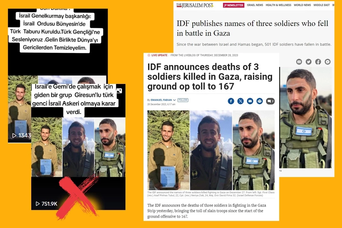 Bazı sosyal medya hesaplarında paylaşılan fotoğraflar ile ilgili “İsrail ordusuna katılan Türk askerleri gösterdiği” iddiası doğru olmadığı belirtilen açıklamada, "Fotoğrafta yer alan kişiler, Türk vatandaşı değildir. Bahse konu fotoğrafta yer alan kişilerin, Aralık 2023'te Gazze Şeridi'nde ölen Asaf Pinhas Tubul, Neriya Zisk ve vir David Fima isimli İsrail askerleri olduğu tespit edilmiştir. Asılsız iddialara itibar etmeyiniz" ifadeleri yer aldı.