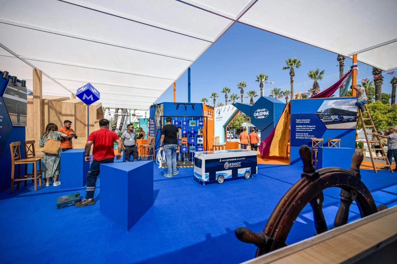 İzmir Büyükşehir Belediyesi Basın, Yayın ve Halkla İlişkiler Dairesi Başkanı Eylem Başar Yıldırım ve Basın, Yayın ve Tanıtım Şube Müdürü Cem Kaya da Belediye Sokağı’ndaki son hazırlıklara eşlik etti. Alanda sunulacak hizmetlere değinen Cem Kaya, “Her yıl olduğu gibi bu yıl da İzmir Büyükşehir Belediyesi Sokağı’nda hem belediye birimlerimizin faaliyetlerini tanıtacağız hem de misafirlerimize konser, tiyatro, bilgi yarışması gibi etkinlikler düzenleyeceğiz. Alanda çocuklarımız için eğitici ve öğretici etkinlikler de gerçekleştireceğiz. Bu yıl ilk kez ‘Ne kadar İzmirlisin’ başlıklı bilgi yarışması düzenliyoruz. Kazanan vatandaşlarımıza sürpriz hediyelerimiz olacak. Bütün vatandaşlarımızı hem belediye olarak faaliyetlerimizi tanımak hem de güzel vakit geçirmek için İzmir Büyükşehir Belediyesi Sokağı’na bekliyoruz” dedi.
