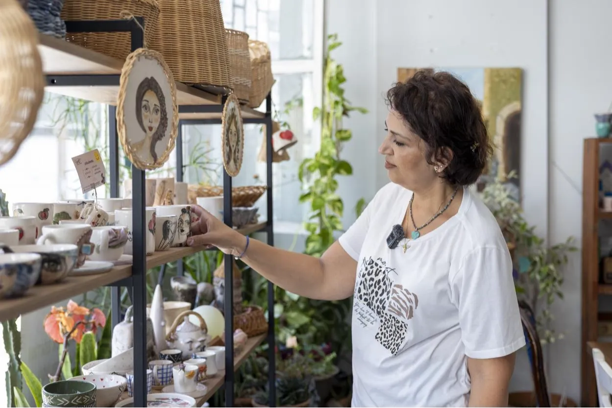 Mersin'de yıllardır hayalini kurduğu atölye kurma fikrini gerçeğe dönüştüren kadın üreticilerden Zeycan Yırtıcı, seramik ürünlerin yanı sıra; bambu, yağlı boya ve farklı el işi ürünlerini de atölyesinde sergiliyor.