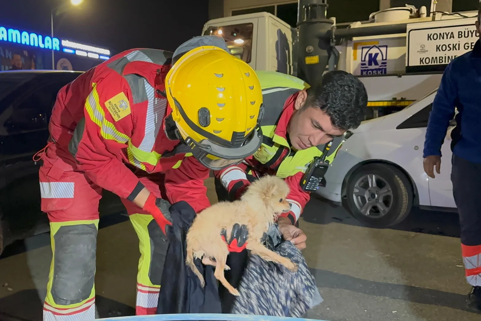 Karatay Fevzi Çakmak Mahallesi Galericiler Sitesi’nde bir galerici esnafının kaybolan “Sütlaç” isimli köpeğinin kanalizasyon borusunda mahsur kaldığı tespit edildi. Esnafın ihbarı üzerine olay yerine Konya Büyükşehir Belediyesi İtfaiye Dairesi Başkanlığı ile KOSKİ Genel Müdürlüğü ekipleri sevk edildi.