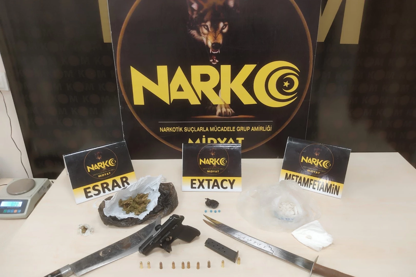 Şehmus EDİS / MARDİN (İGFA) - Polis ekipleri ilk operasyonu Midyat ilçesinde gerçekleştirdi. Midyat Narkotik Suçlarla Mücadele Büro Amirliği ekipleri, uyuşturucu madde kullanan 3 şahsı kıskıvrak yakaladı. Devam eden çalışmalarda, yakalanan 1 şahsın ikametinde de arama yapıldı. Operasyon kapsamında, 121.86 gram metamfetamin, 25.69 gram esrar, 4 adet ecstasy hap, 1 adet ruhsatsız tabanca, 2 adet şarjör, 10 adet fişek ve 2 adet kesici alet ele geçirildi. Konuyla ilgili yakalanan 3 şahıstan 1'i sevk edildiği adli makamlarca tutuklanarak cezaevine konuldu.
