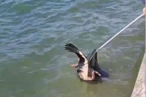 Yaralı olarak denize düşen leyleği Kocaeli Büyükşehir Belediyesi İtfaiye ekipleri kurtardı