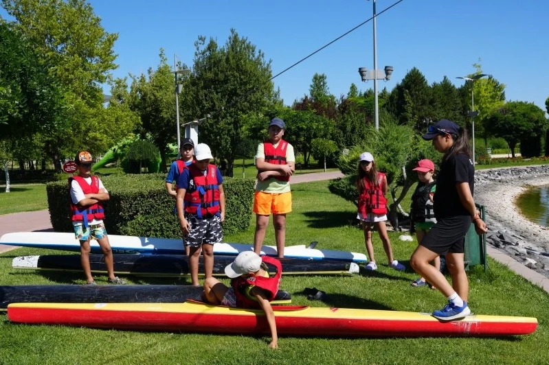 Gençlik ve Spor Hizmetleri Dairesi Başkanlığı tarafından organize edilen eğitimlerde, 8 ile 17 yaş aralığındaki çocuklar, su sporlarıyla tanışarak hem eğleniyor hem de temel kano becerilerini öğreniyor.